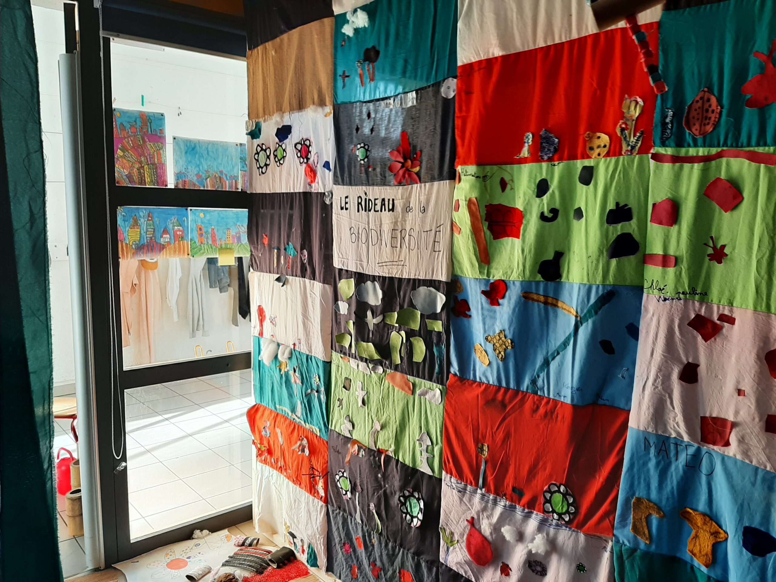 Par sous-groupe, les enfants sont venus nouer, déchirer, tisser, coudre, coller, découper… pour créer des animaux , des végétaux et les assembler pour créer un grand rideau de la biodiversité, installé dans leur salle de motricité.