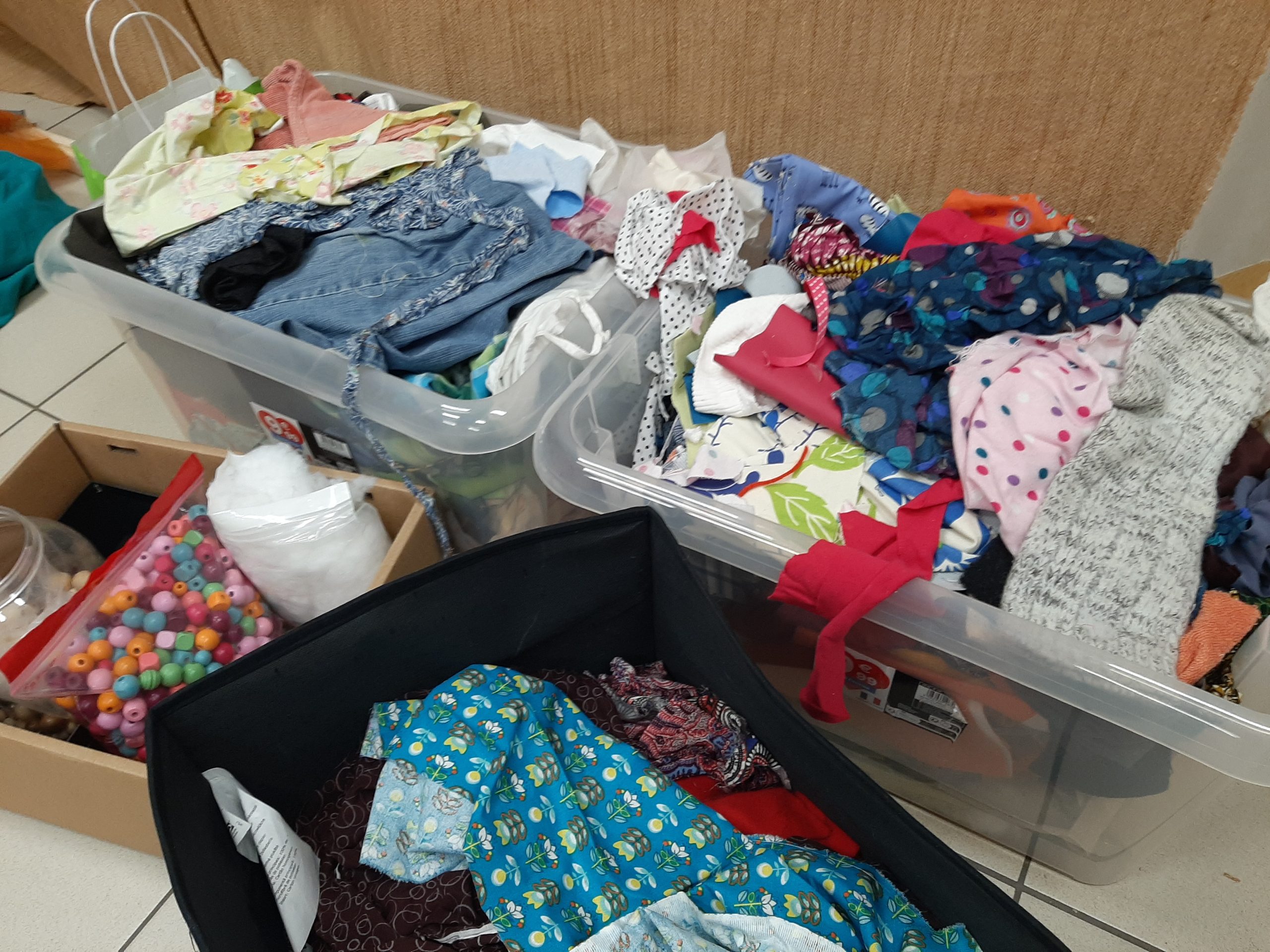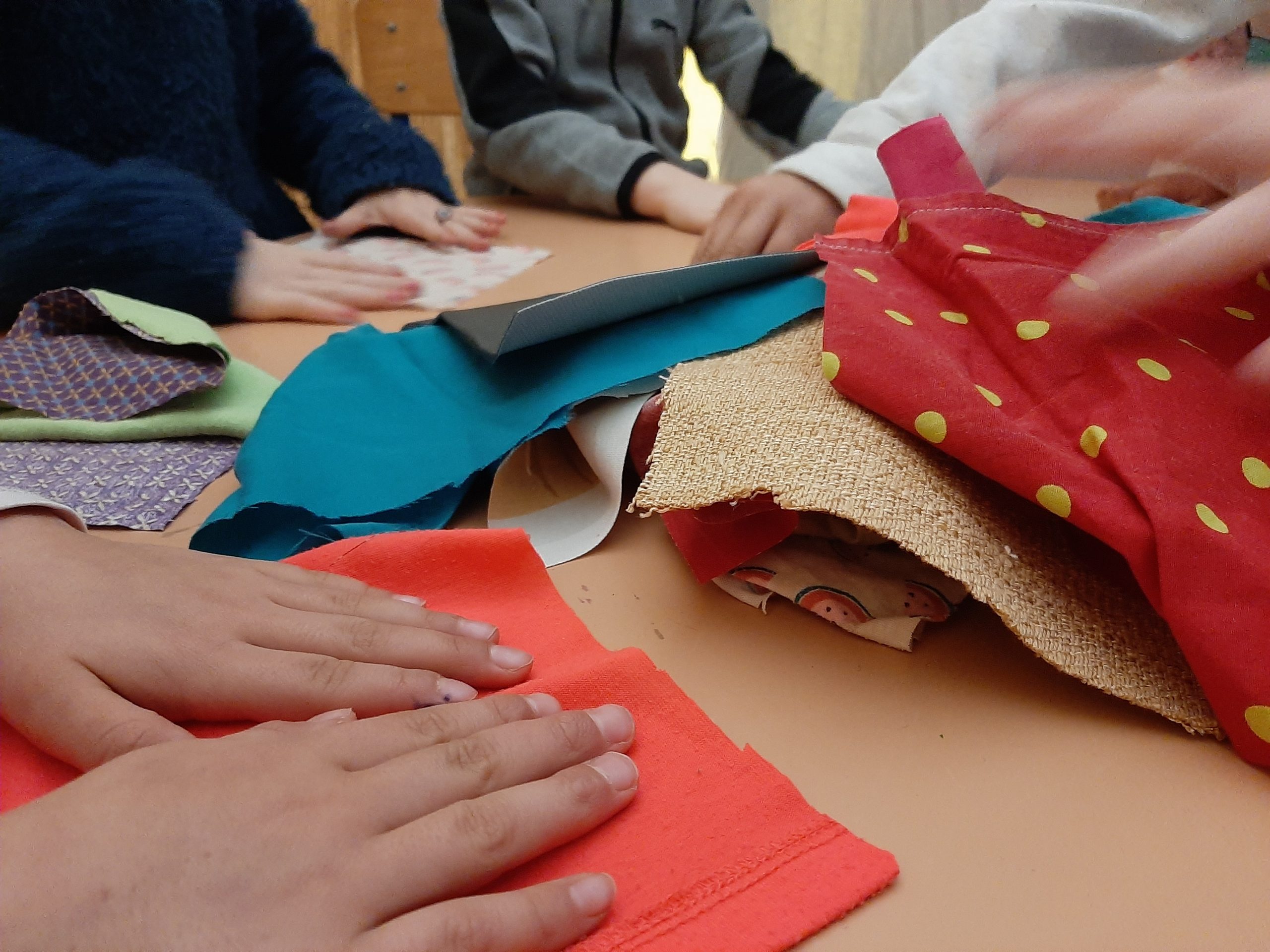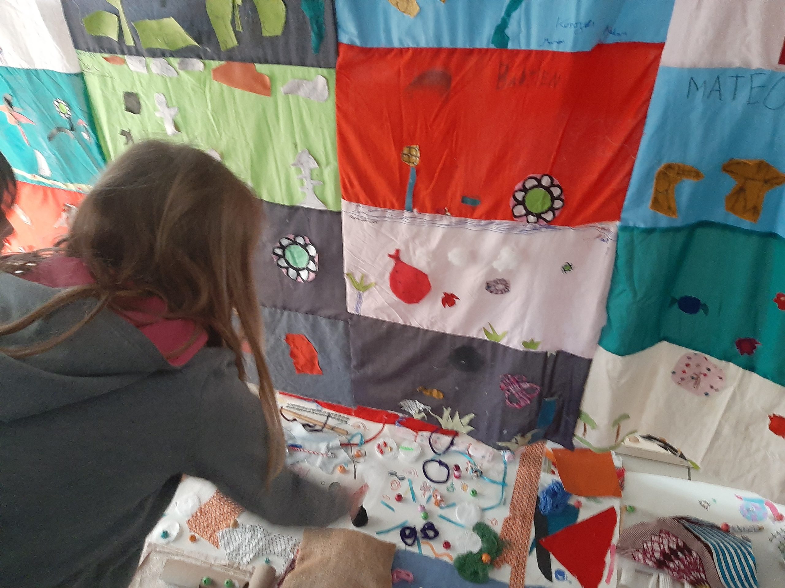Nous avons ensemble exploré ces gestes et différentes matières récupérées : lainage, draps, textiles, ficelles, boutons, ouatine, fermetures éclairs…