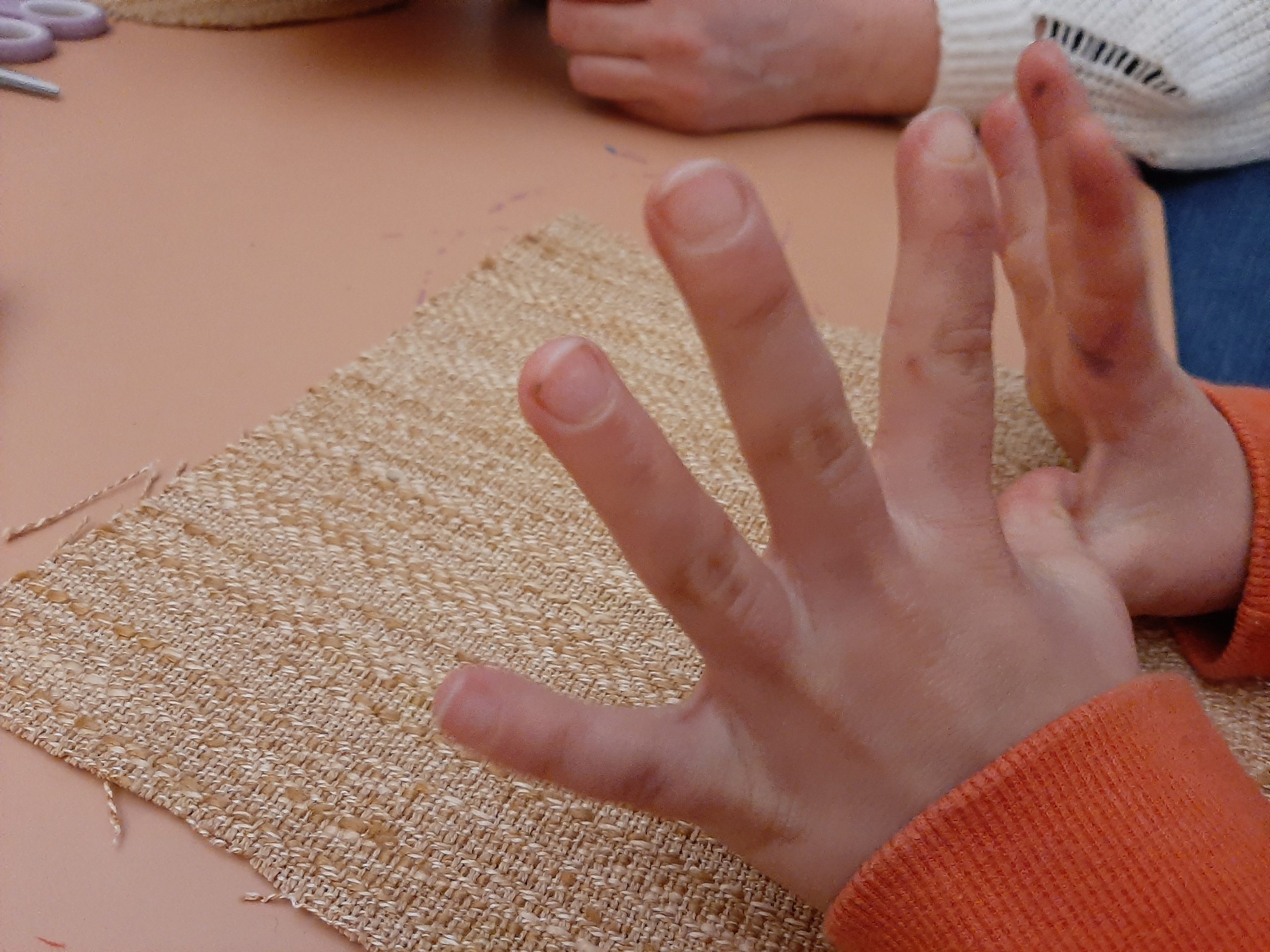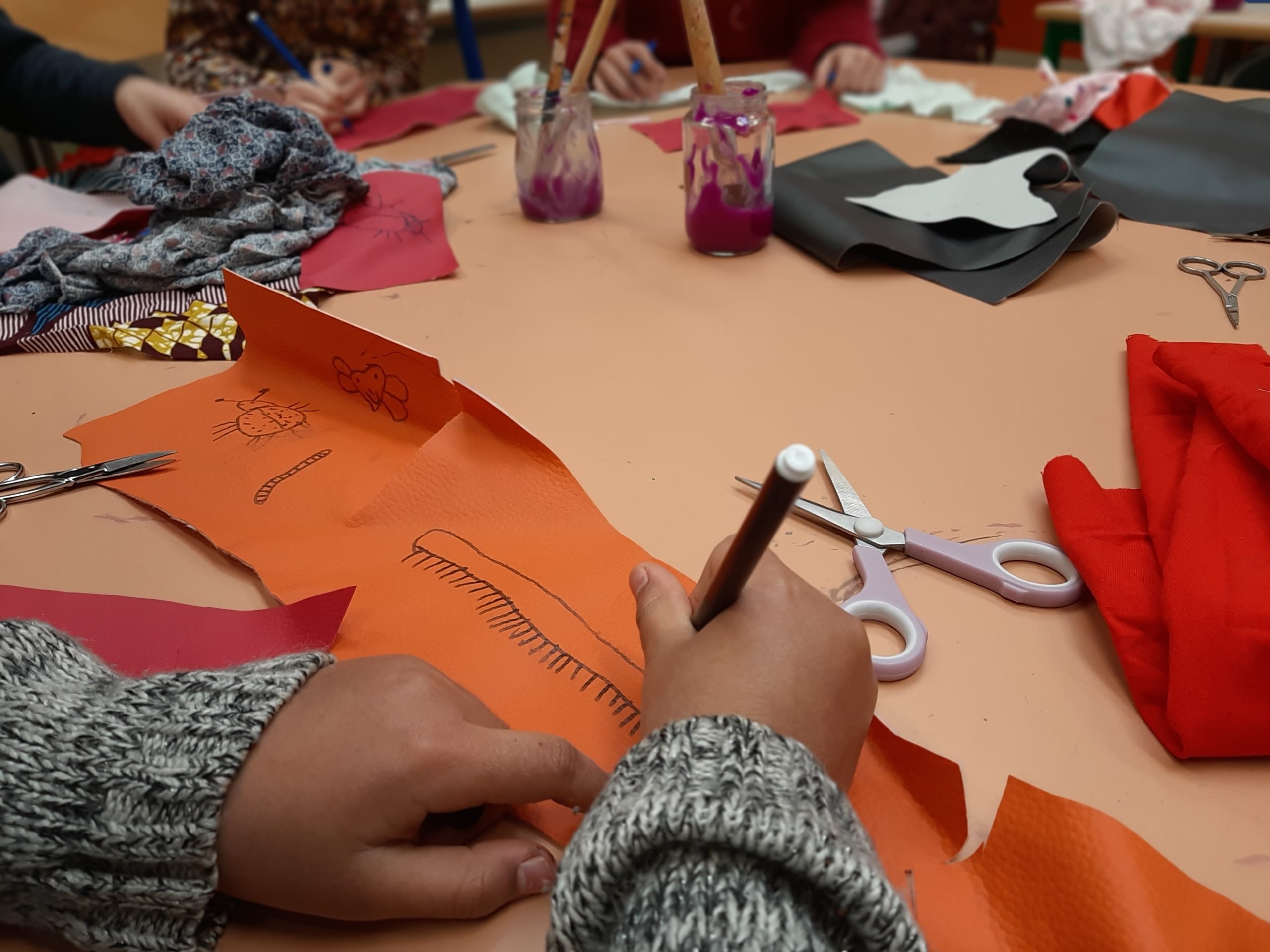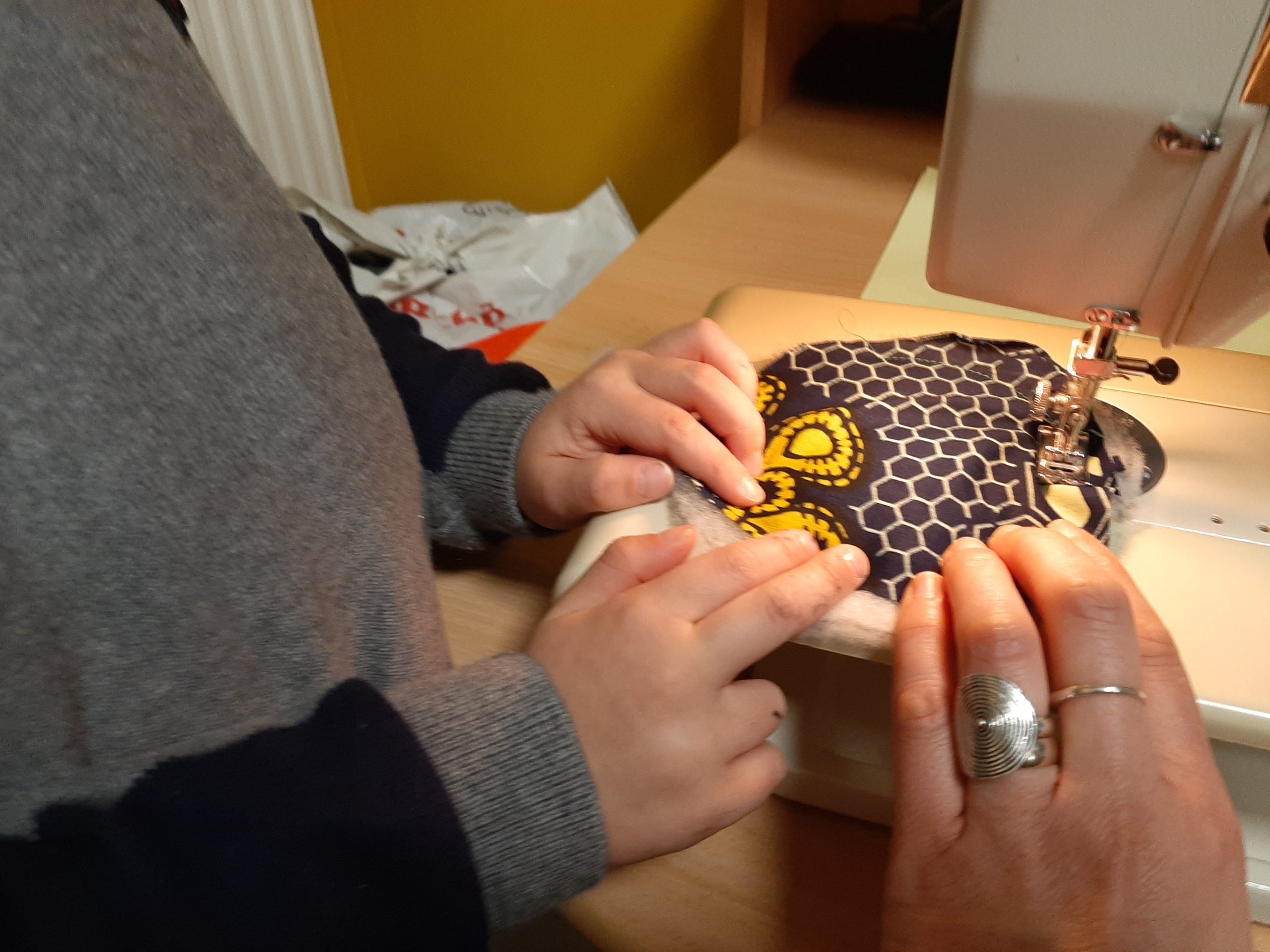 Nous avons ensemble exploré ces gestes et différentes matières récupérées : lainage, draps, textiles, ficelles, boutons, ouatine, fermetures éclairs…
