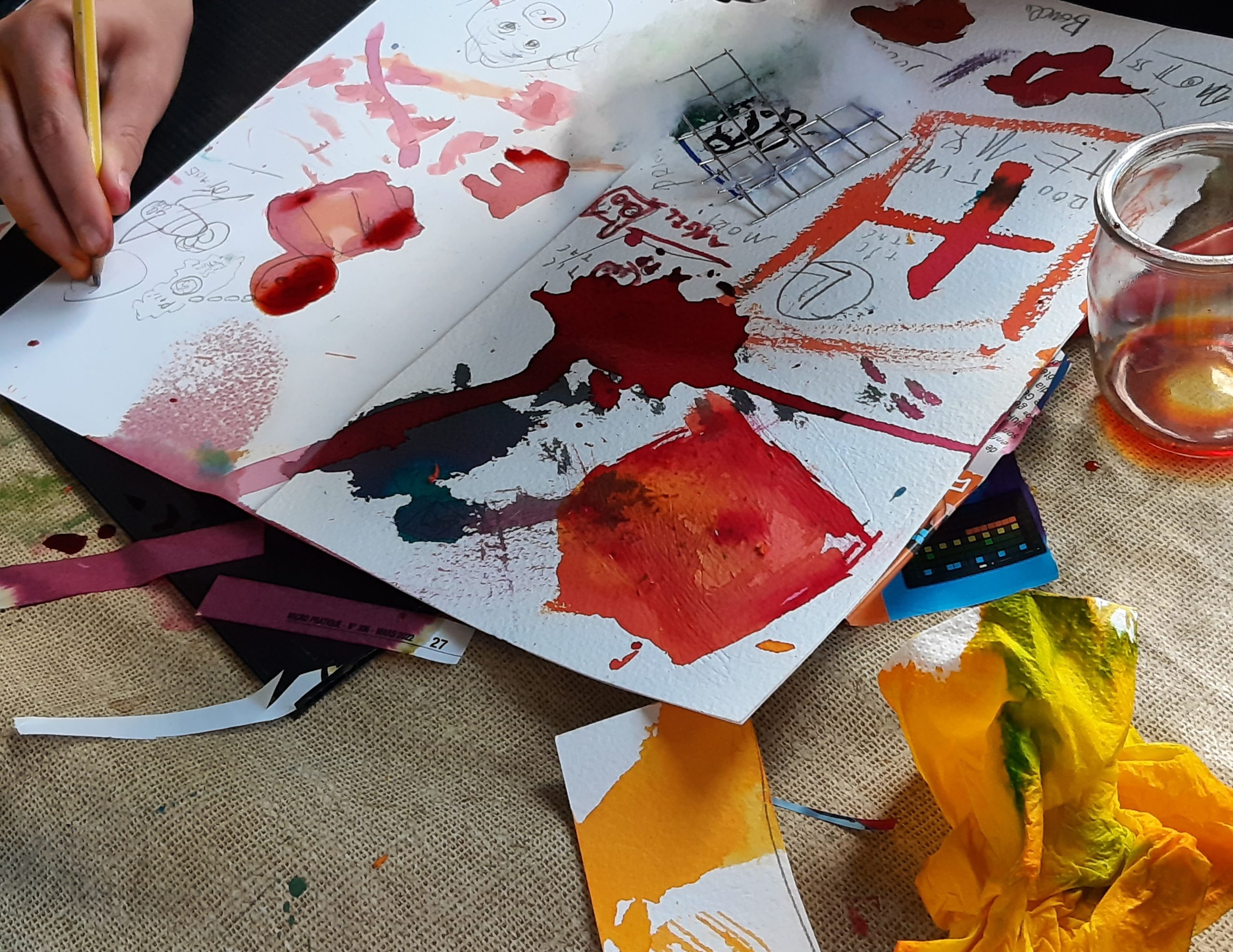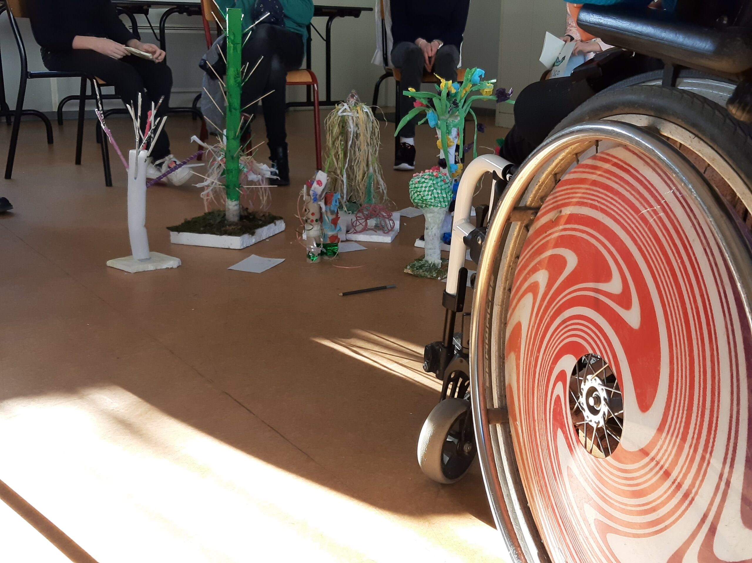Lors de ce projet mené sur 2 années, les jeunes adolescents accompagnés par le SESSAD APF France handicap, se sont réunis 1 journée à chaque vacances scolaires, pour créer ensemble. Ces ateliers étaient, pour aux, autant d’occasions d’avoir un espace pour exprimer leurs émotions autrement que par les mots. Ils l’ont fait par les matières, par le mouvement. Chacun a, petit à petit, pris confiance en ses gestes et en son expression propre, unique, différente de celle du copain ou de la copine d’à côté.