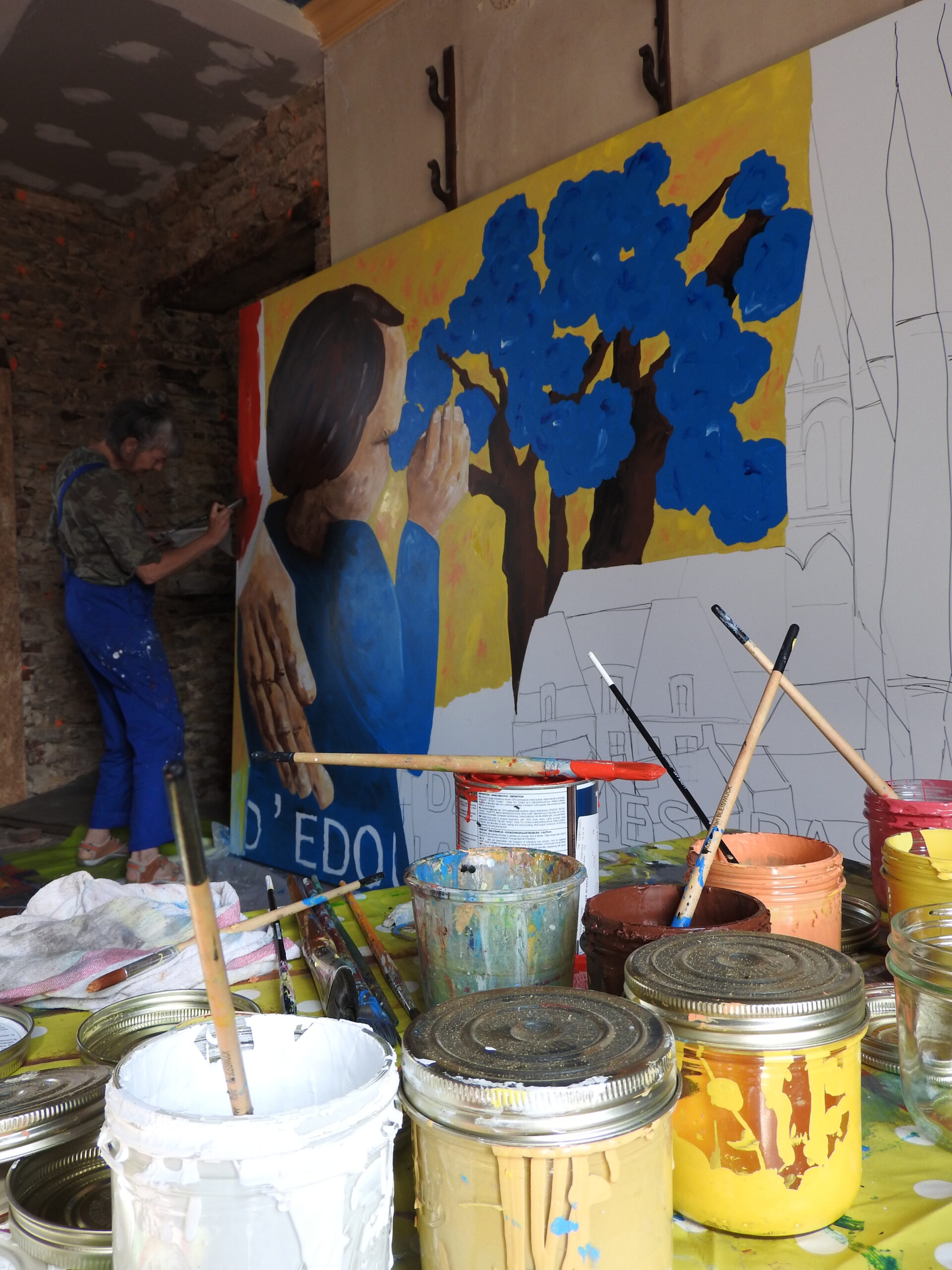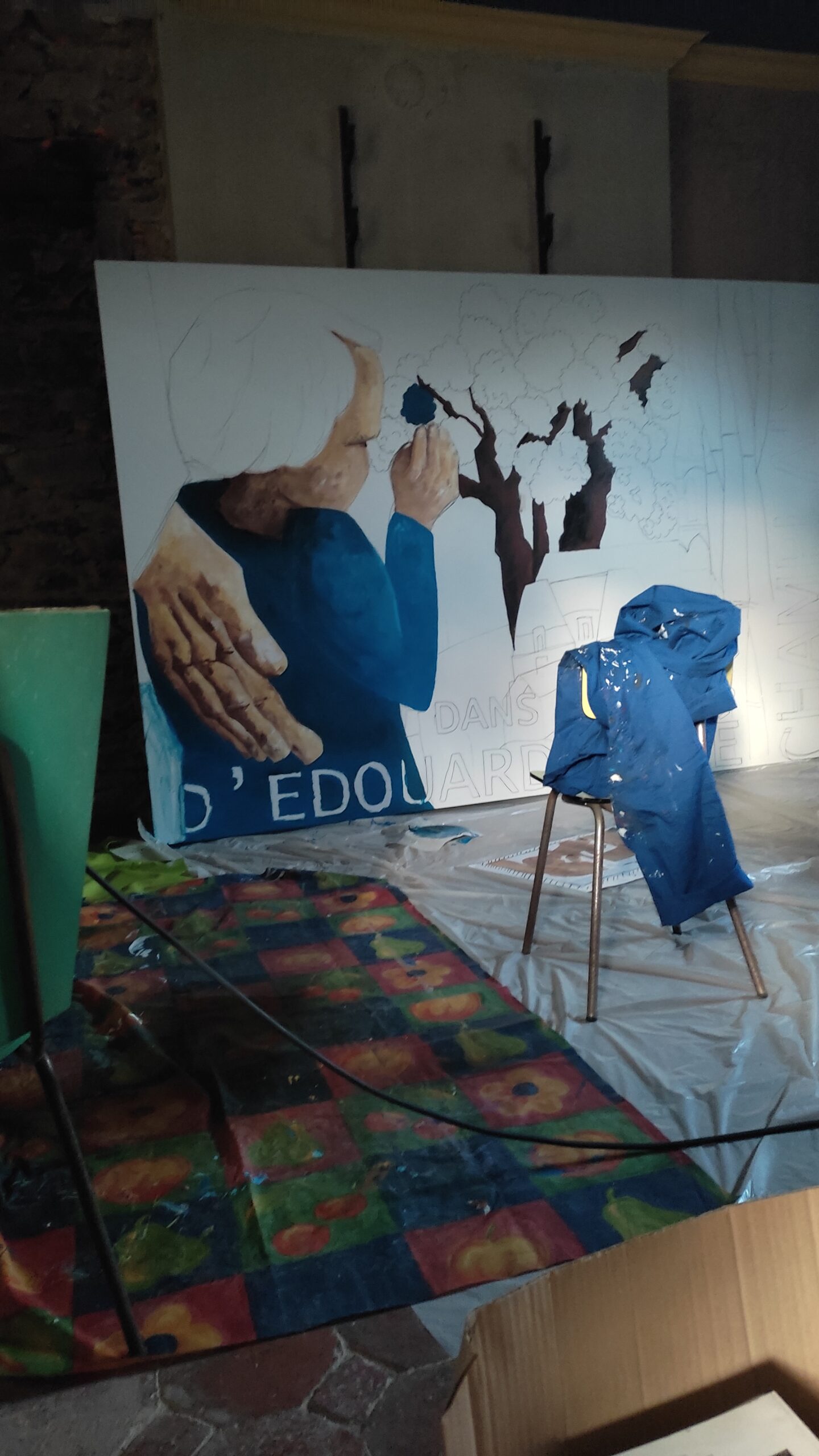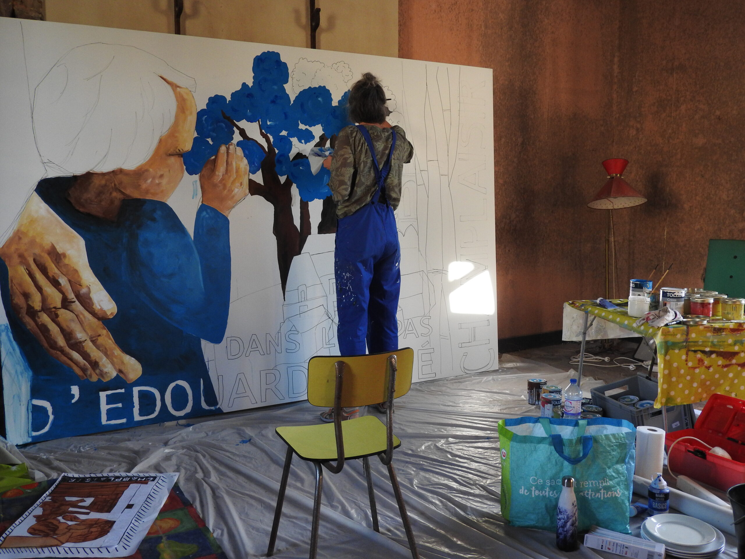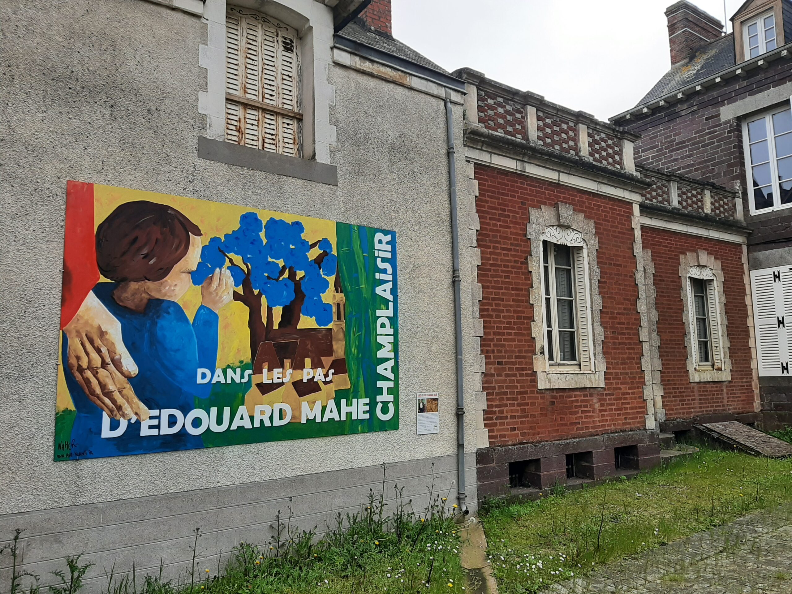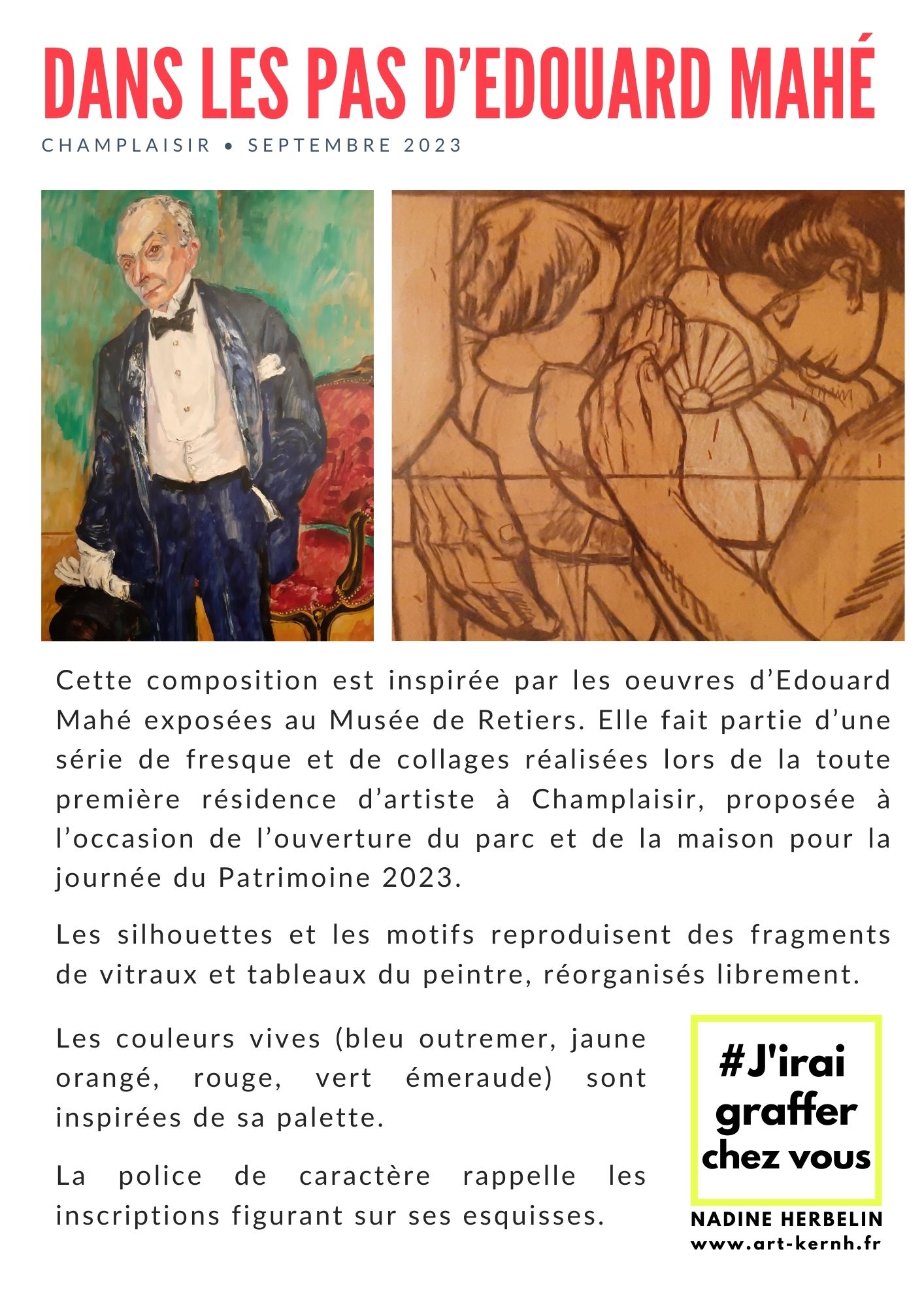 Réalisation d’une fresque sur Dibond format 2,50 x 2 m inspirée par les oeuvres du peintre. Cette composition est inspirée par les oeuvres d’Edouard Mahé exposées au Musée de Retiers. Elle fait partie d’une série de fresque et de collages réalisées lors de la toute première résidence d’artiste à Champlaisir, proposée à l’occasion de l’ouverture du parc et de la maison pour la journée du Patrimoine 2023.