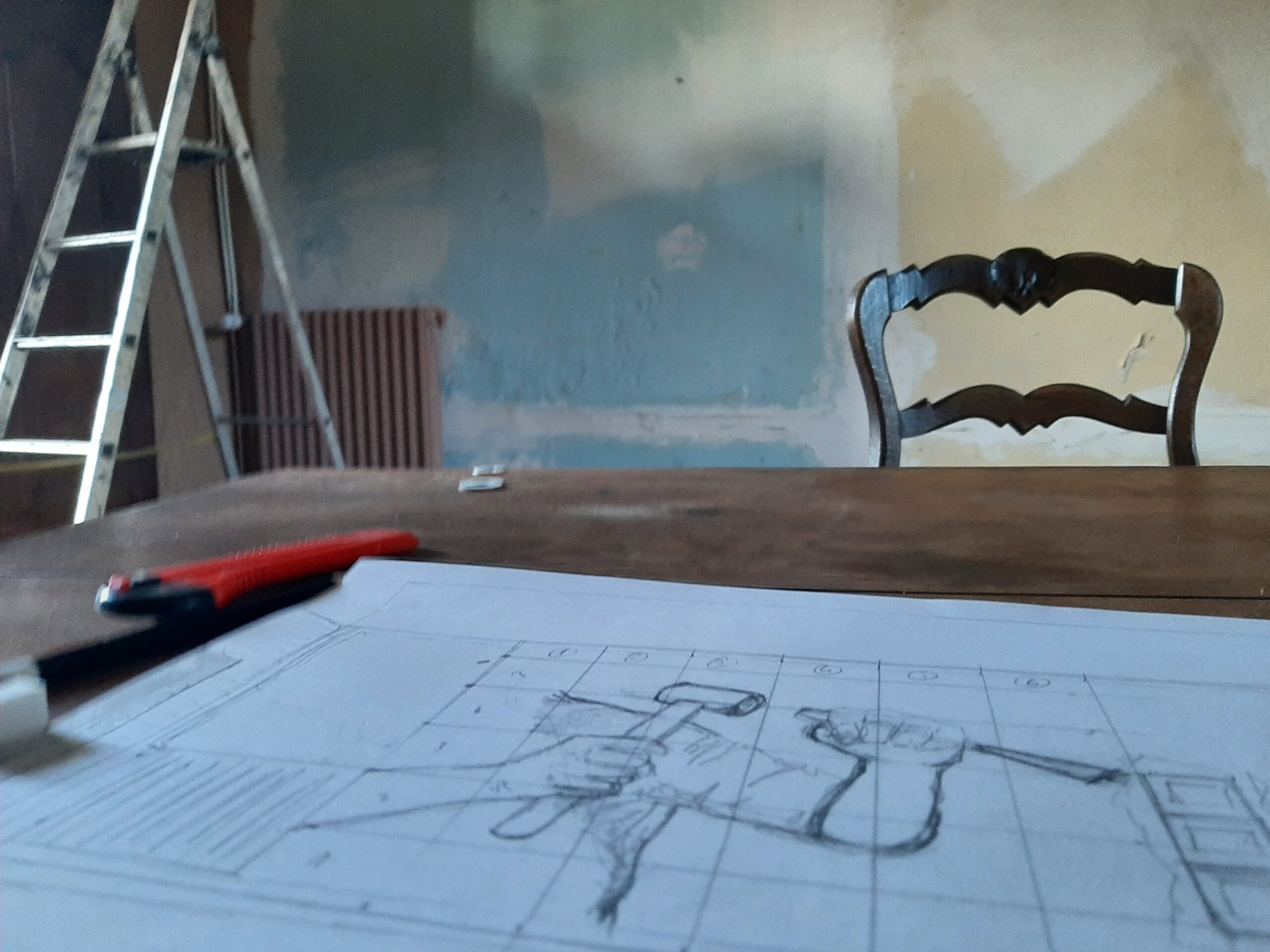 Un chantier de rénovation peut parfois durer longtemps. Ici, les maçons terre-paille ont eu l’idée de me proposer de réaliser une fresque pour orner les murs, le temps des travaux. J’ai choisi de prendre leurs gestes en photo. Un vrai plaisir de travailler avec cette fabuleuse équipe !