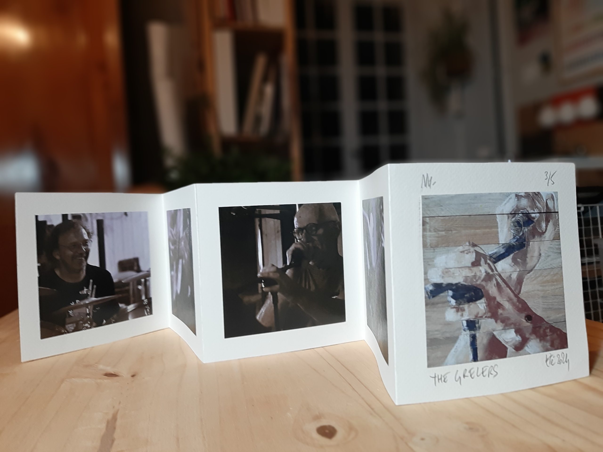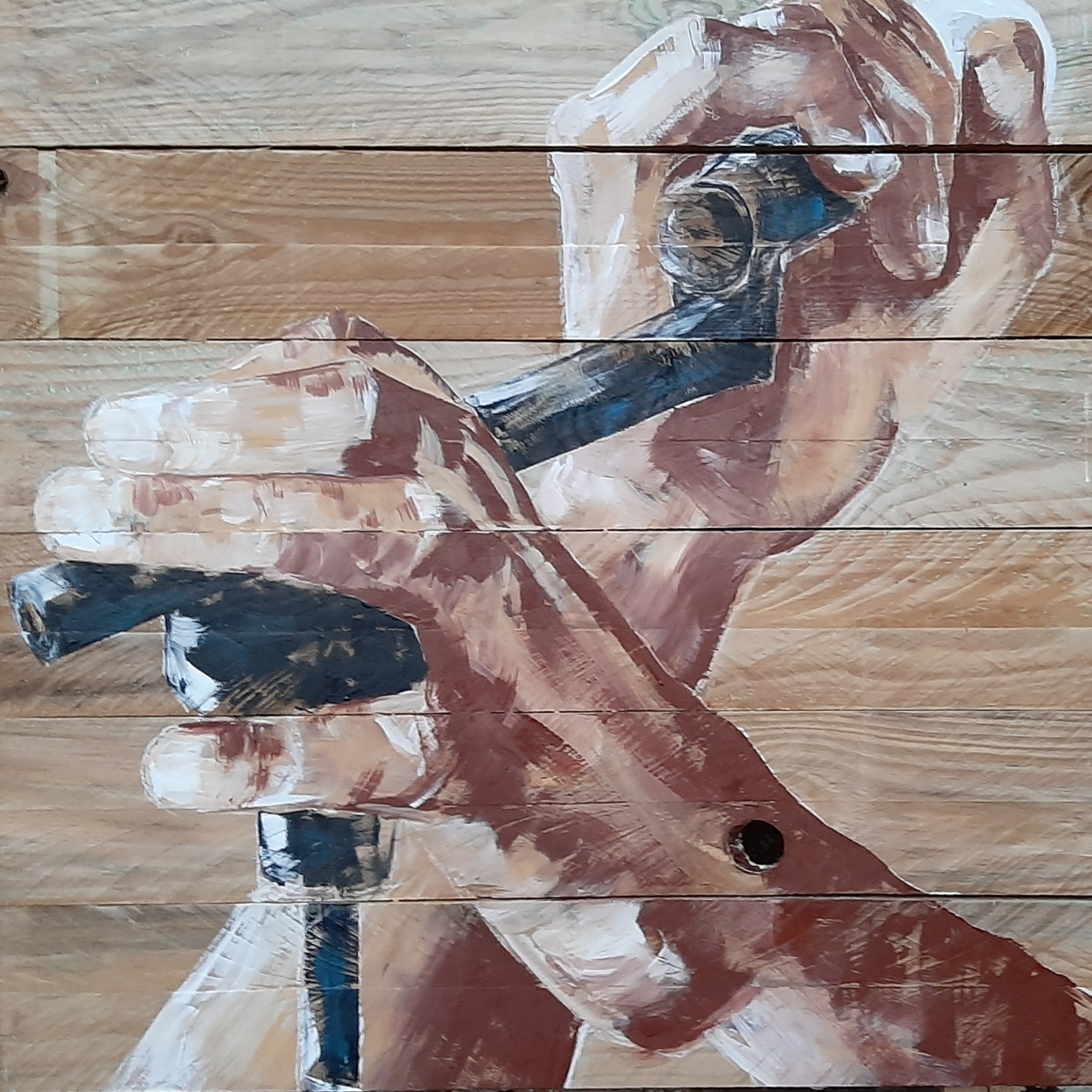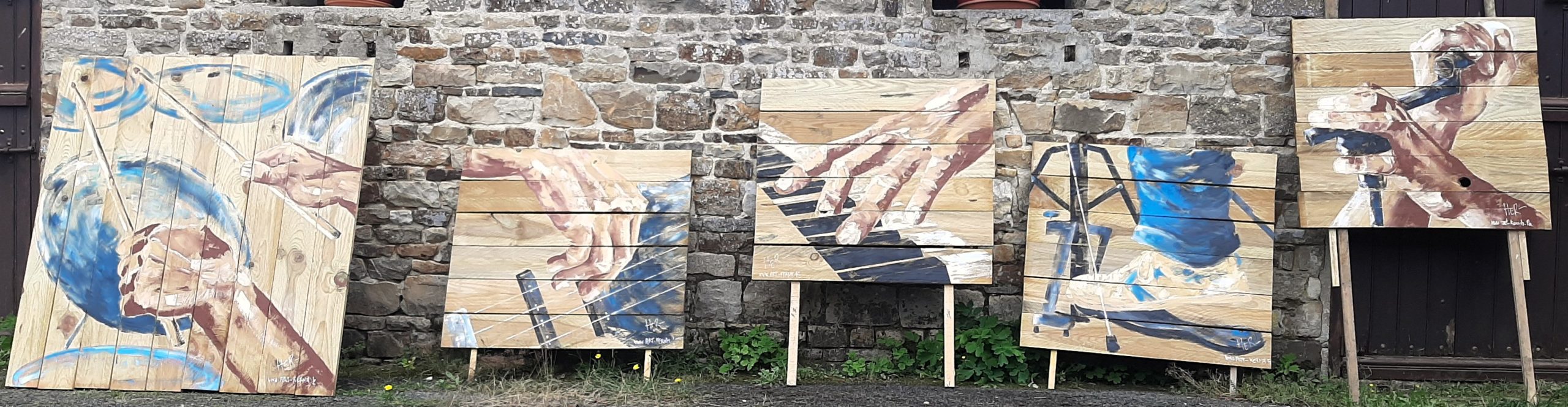 Alors je suis allée voir un des groupes en répétition, j’ai pris leurs gestes en photo, et j’ai imaginé ces 5 panneaux reprenant les gestes du bassiste, du chanteur, du batteur, du clavier.