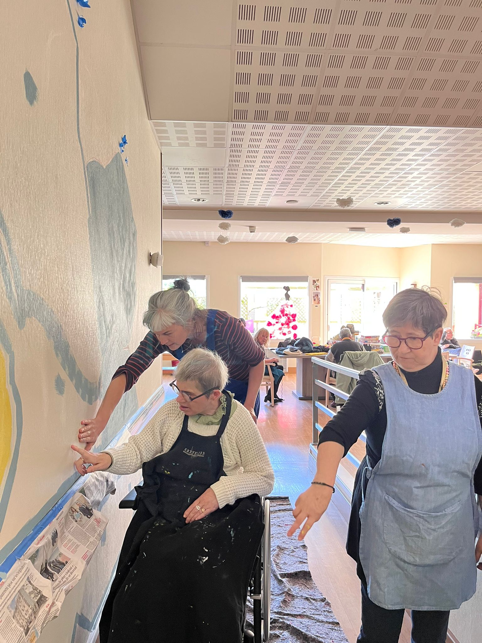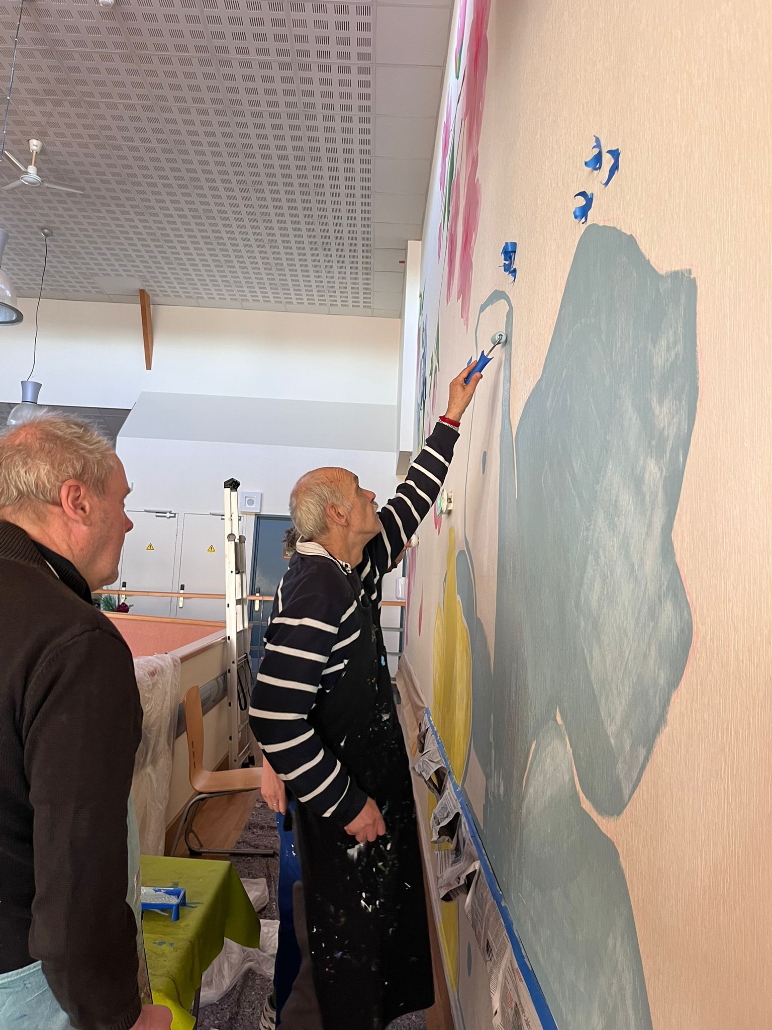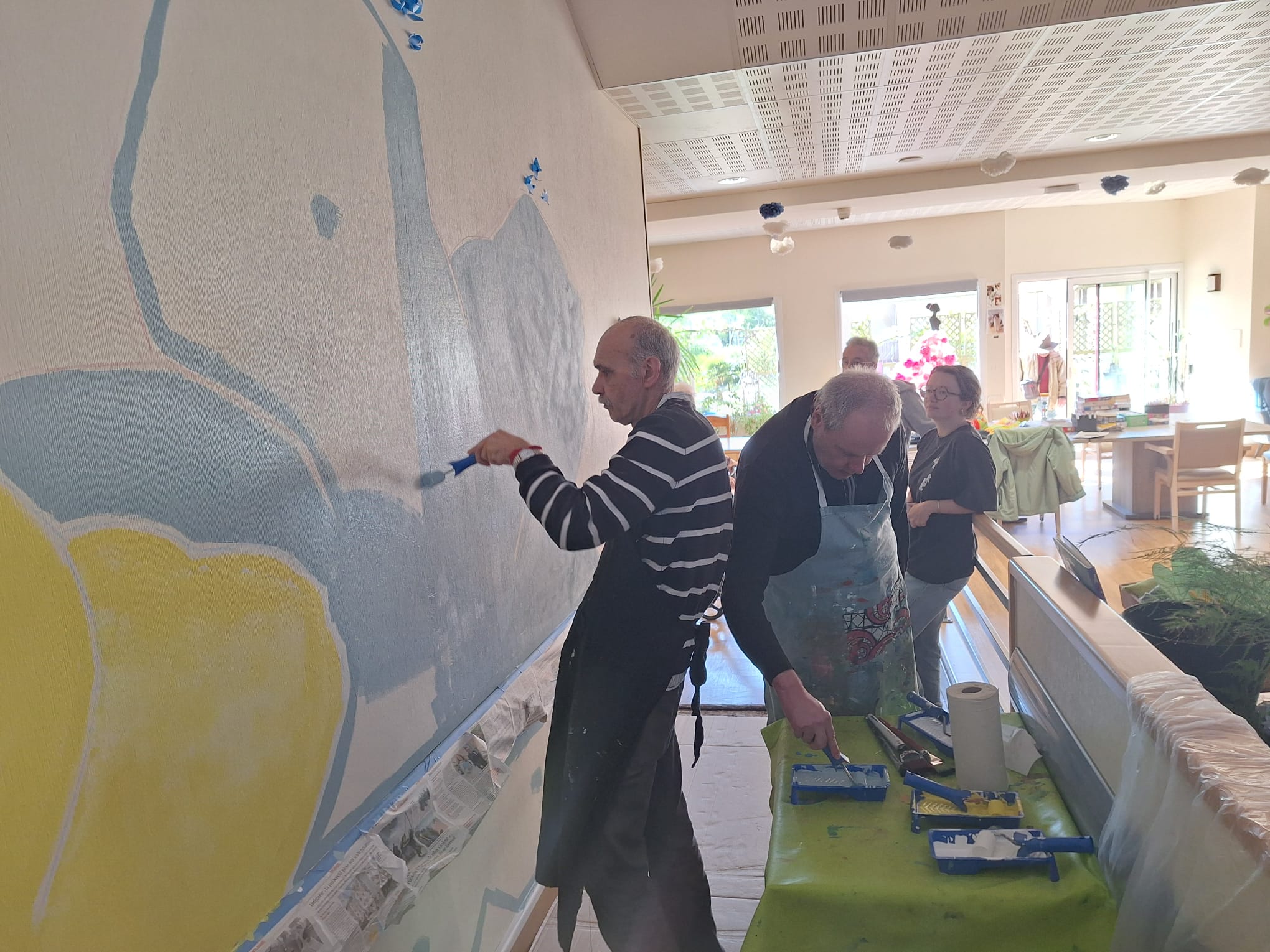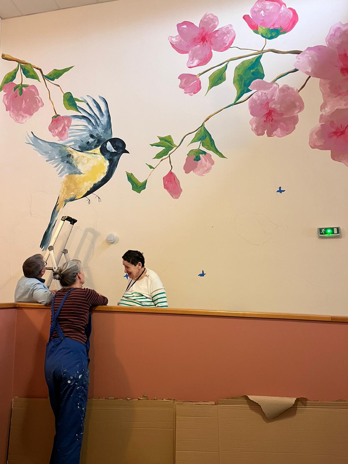 - Elaboration de la fresque à partir des croquis et des essais de couleurs réalisés avec les résidents