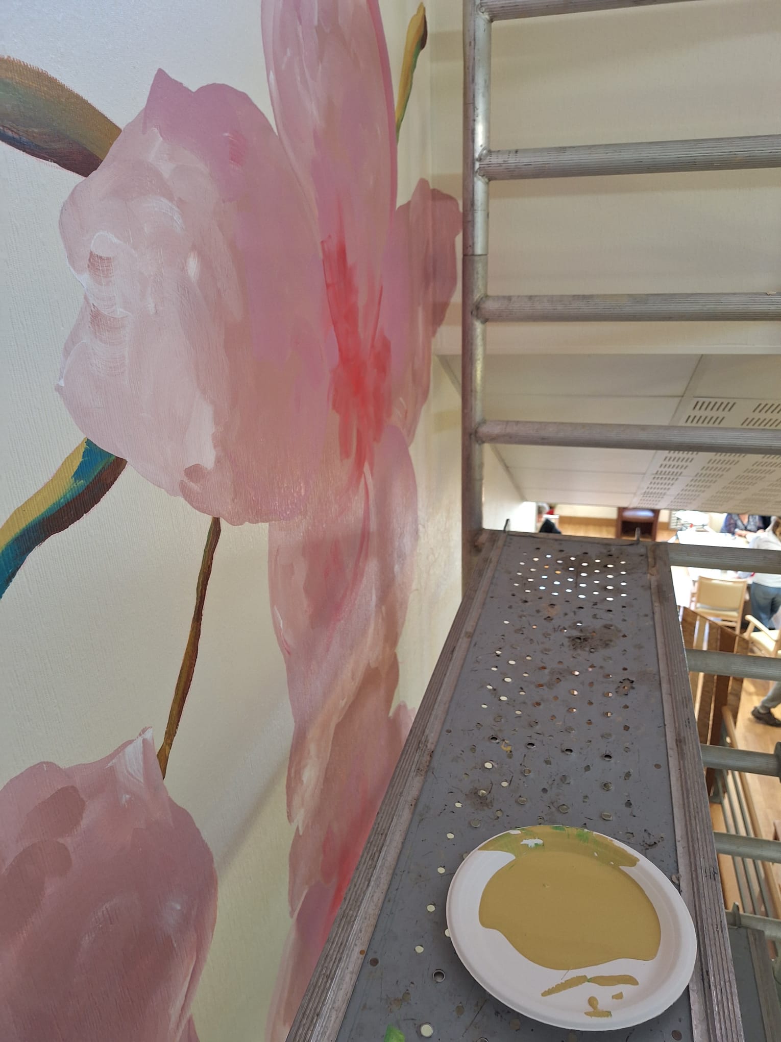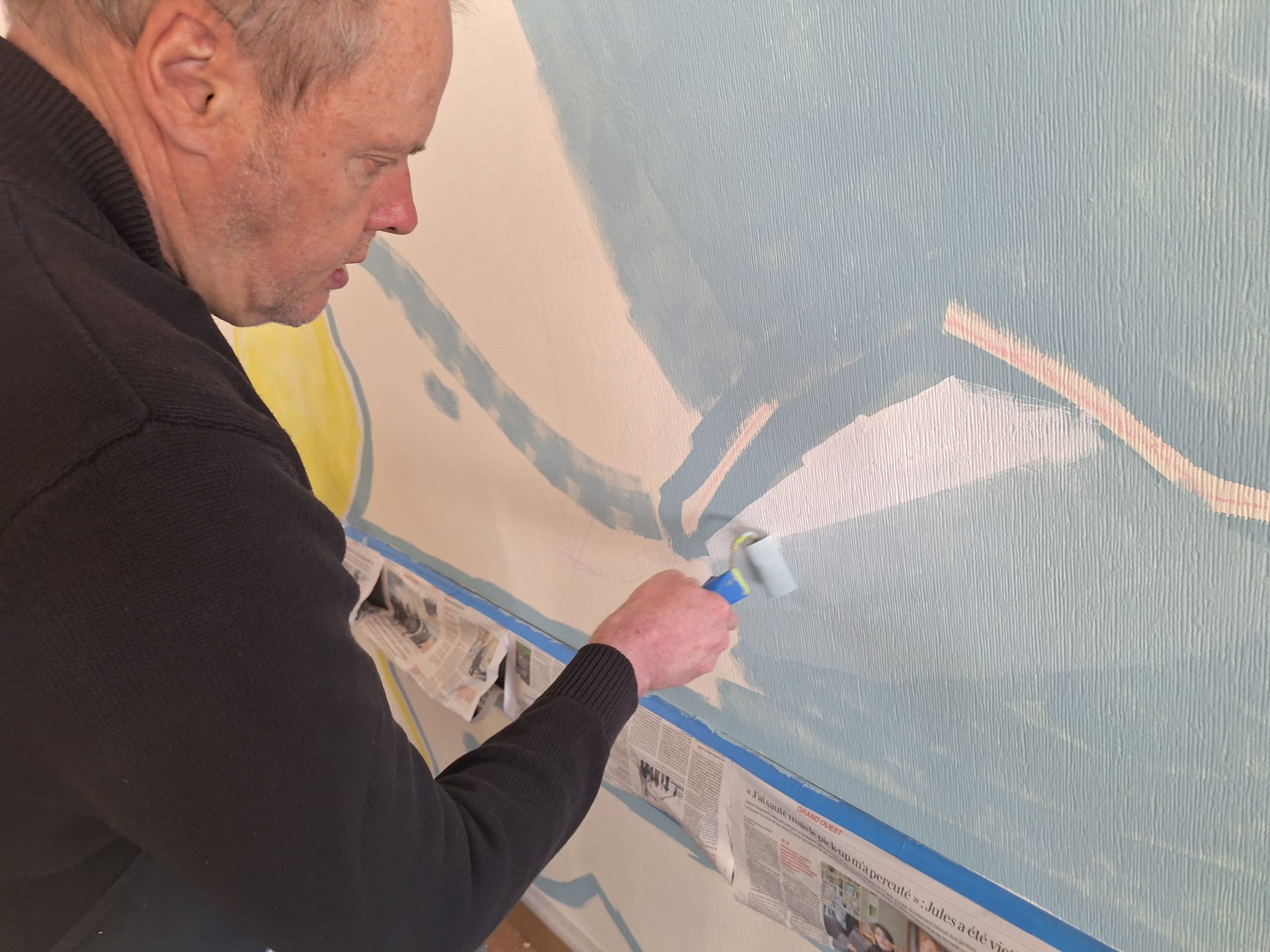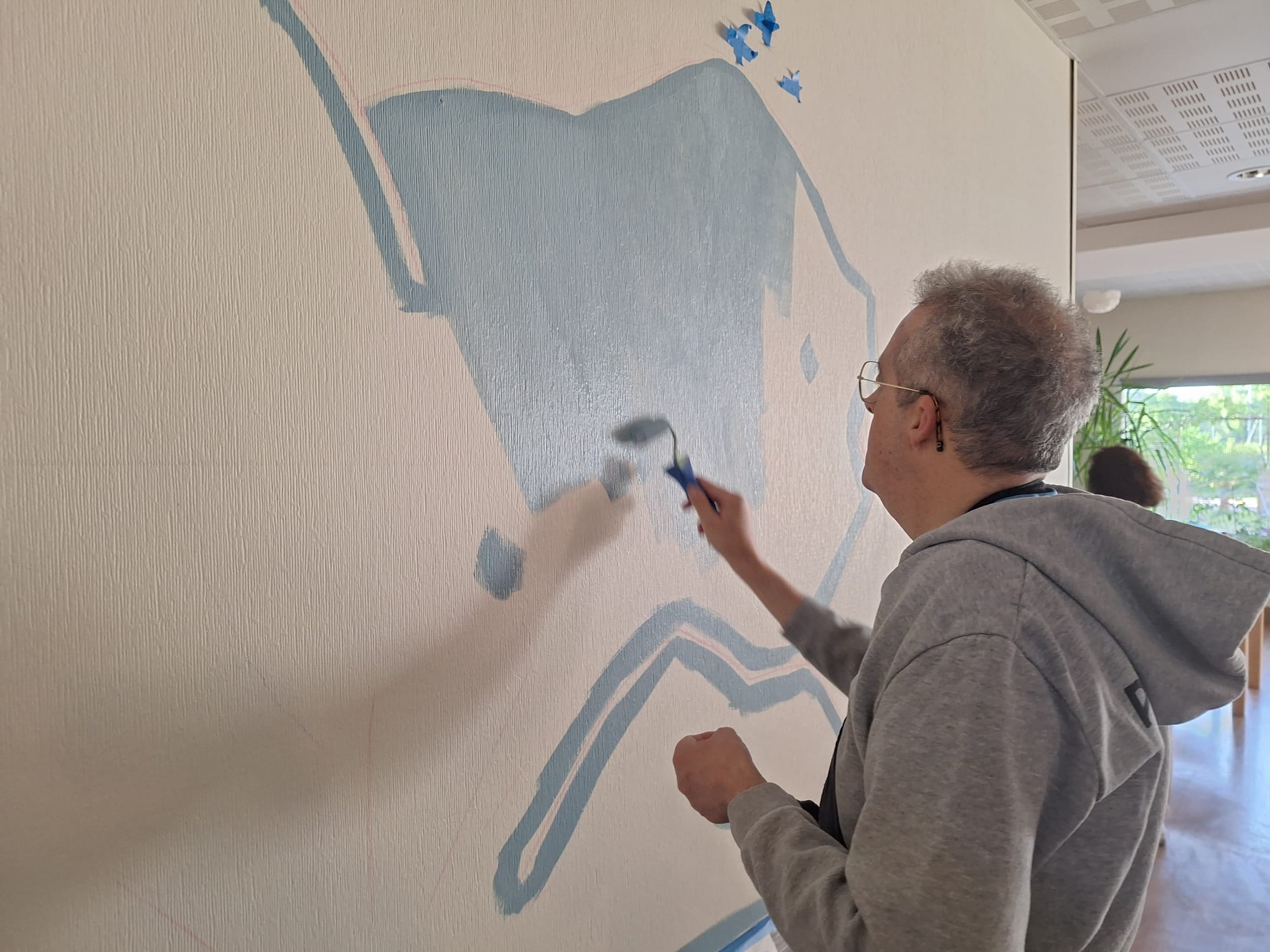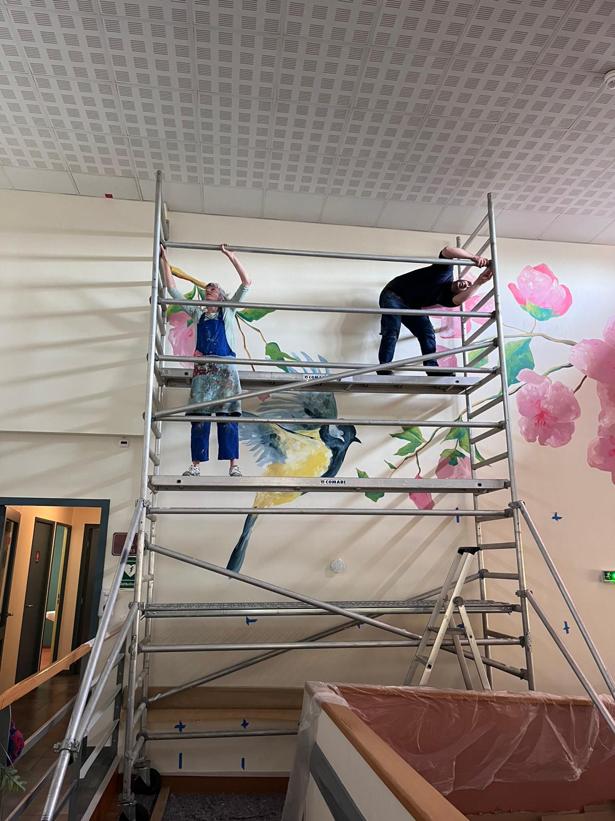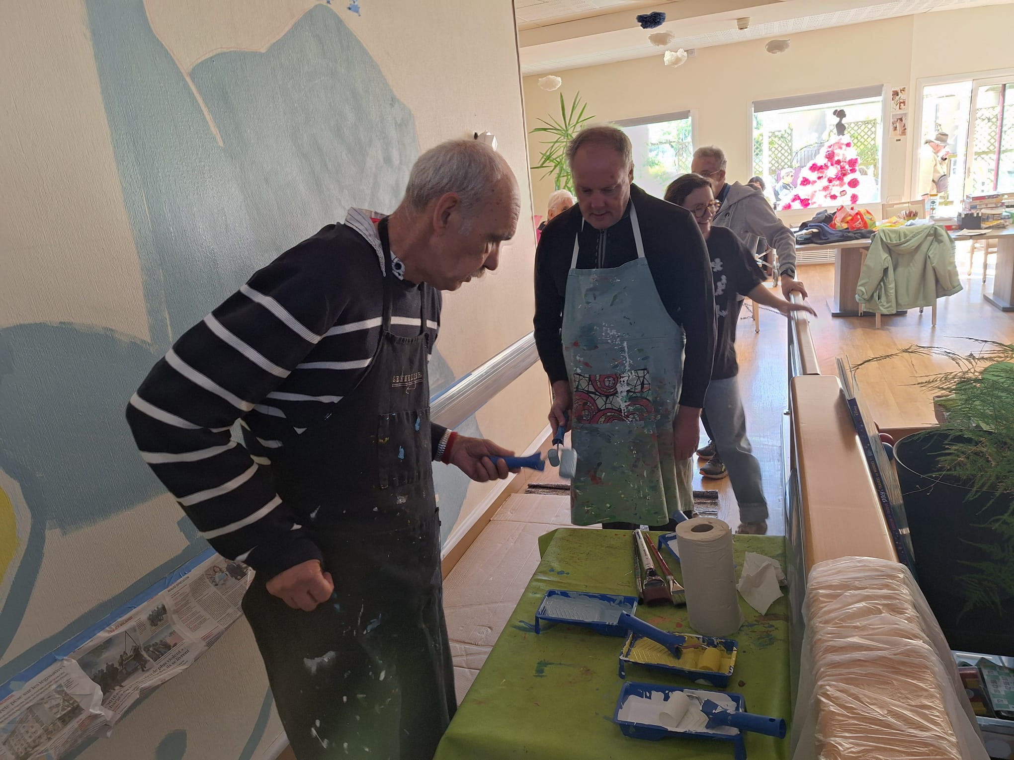 - Elaboration de la fresque à partir des croquis et des essais de couleurs réalisés avec les résidents